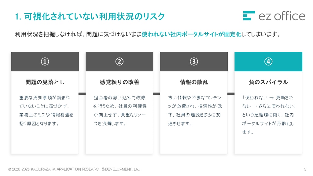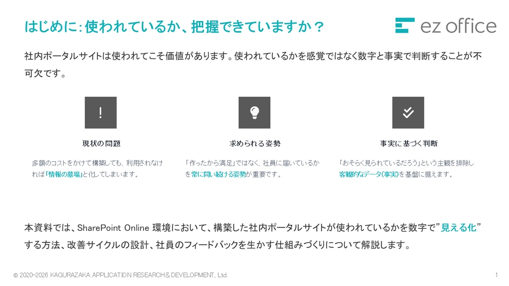 この資料では、社内ポータルサイトを客観的なデータで評価・改善するための手法をご紹介しています。社内ポータルサイトの評価が上手くいっていない方へ、使われているか数字で把握するための方法をお届けします。 下記に当てはまる方は、ぜひ資料をダウンロードください。